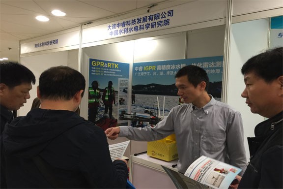 新技術成果裝備展示會場內,大連中睿科技發展有限公和中國水利水電科學研究院的聯合展位上,展出的冰水一體化雷達、無人機飛航測冰雷達和便攜式測冰雷達儀吸引了眾多與會代表參觀了解,詢問設備性能和技術指標,大連中睿科技發展有限公司副總經理、陳潔博士熱情的為與會專家和代表做了詳細介紹和說明。